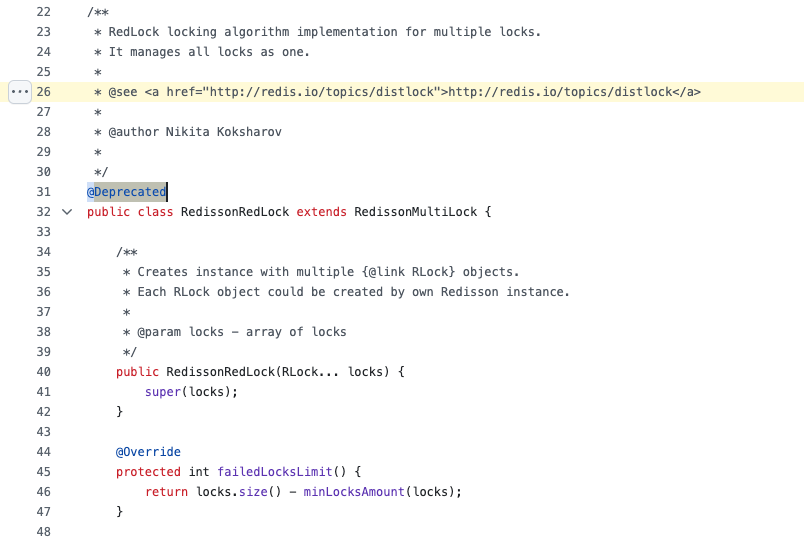 在我们常用的 Redisson 中是支持 RedLock 的,但是在后续的版本中已经被废弃(Deprecated)了: