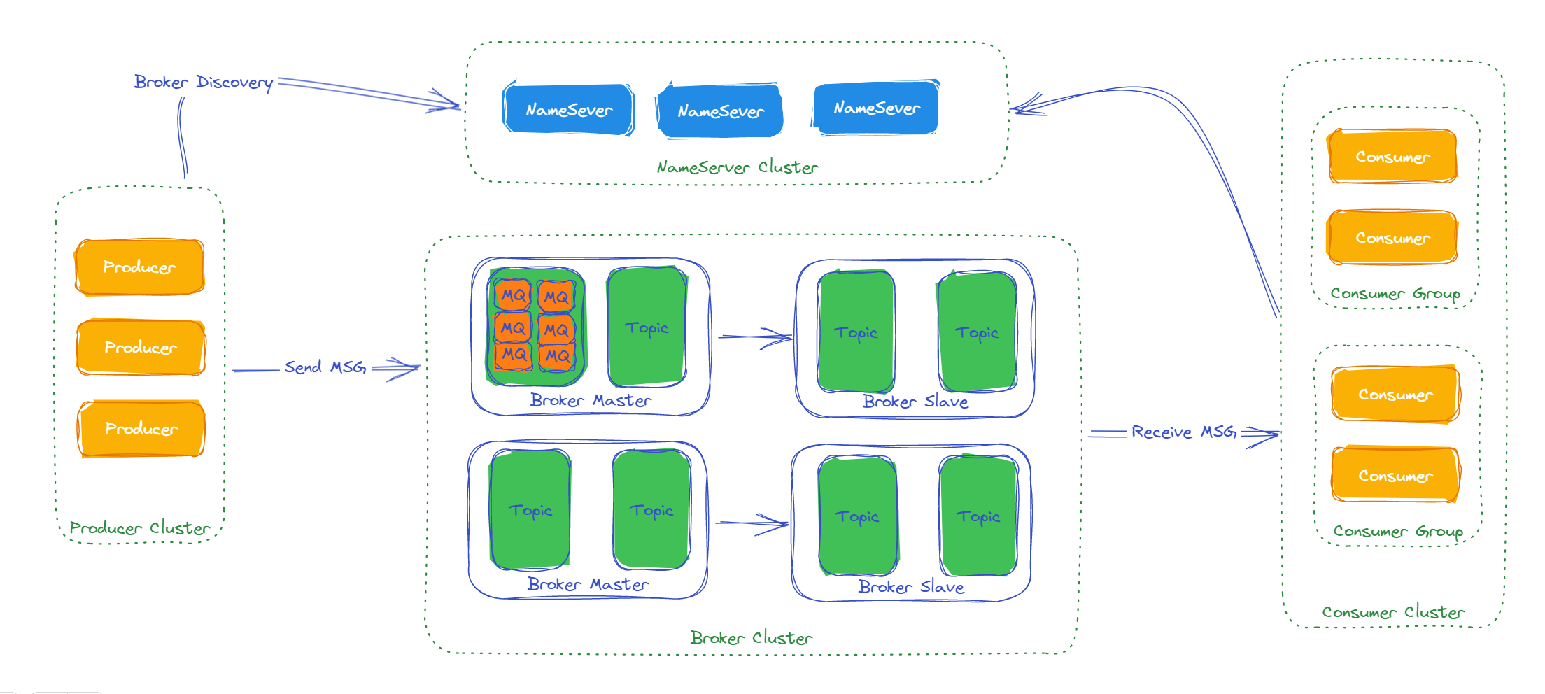 - Broker:消息中转服务器,负责存储和转发消息。RocketMQ支持多个Broker构成集群,每个Broker都拥有独立的存储空间和消息队列。