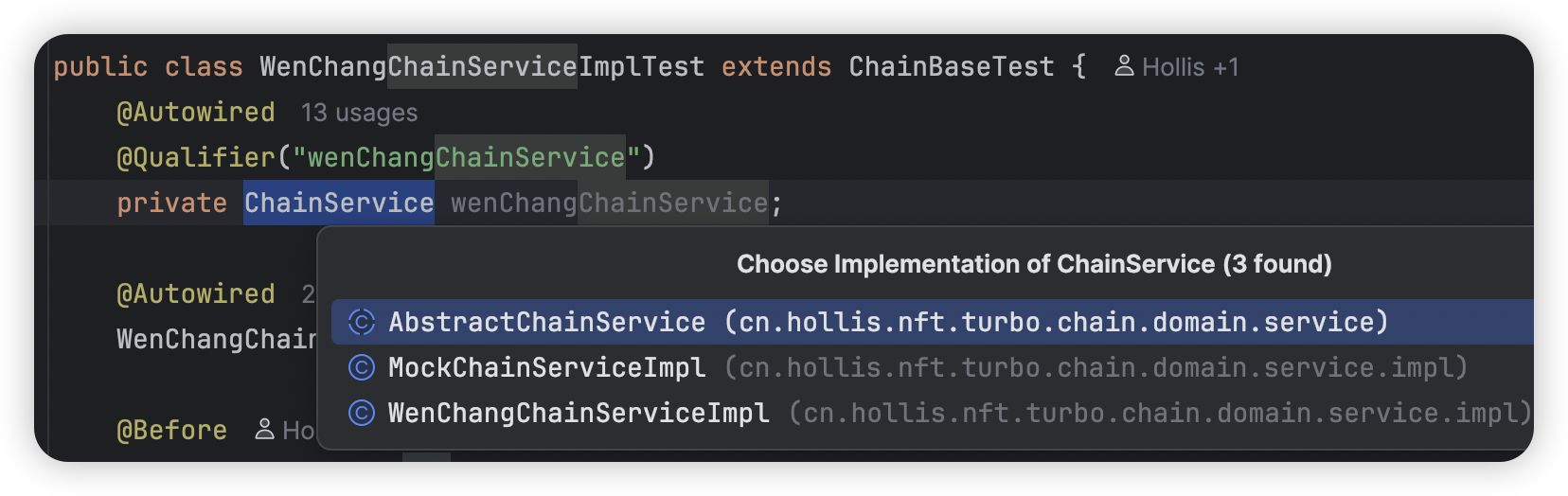 如以下示例中,ChainService有多个实现的时候,需要Qualifier指定具体要注入的beanName
