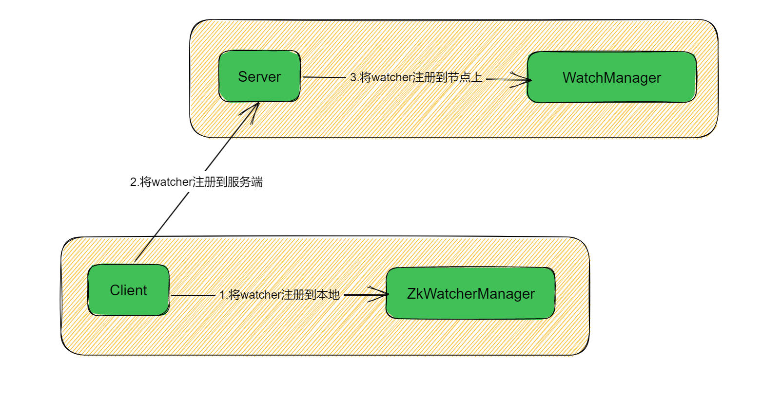 Zookeeper服务端接收到客户端发送的watcher信息后,会将该watcher信息交给WatchManager处理。WatchManager会将该watcher注册到相应的znode节点上,并将watcher相关的信息保存在内存中。